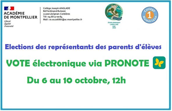 Par admin joseph-anglade, publié le jeudi 2 octobre 2025 14:37 - Mis à jour le vendredi 3 octobre 2025 08:52Cette année, l'élection des représentants des parents d'élèves se fera par voie électronique via Pronote. Le scrutin est prévu du lundi 6 octobre 8h au vendredi 10 octobre 12h. Vous trouverez ci-joint le tutoriel. -
